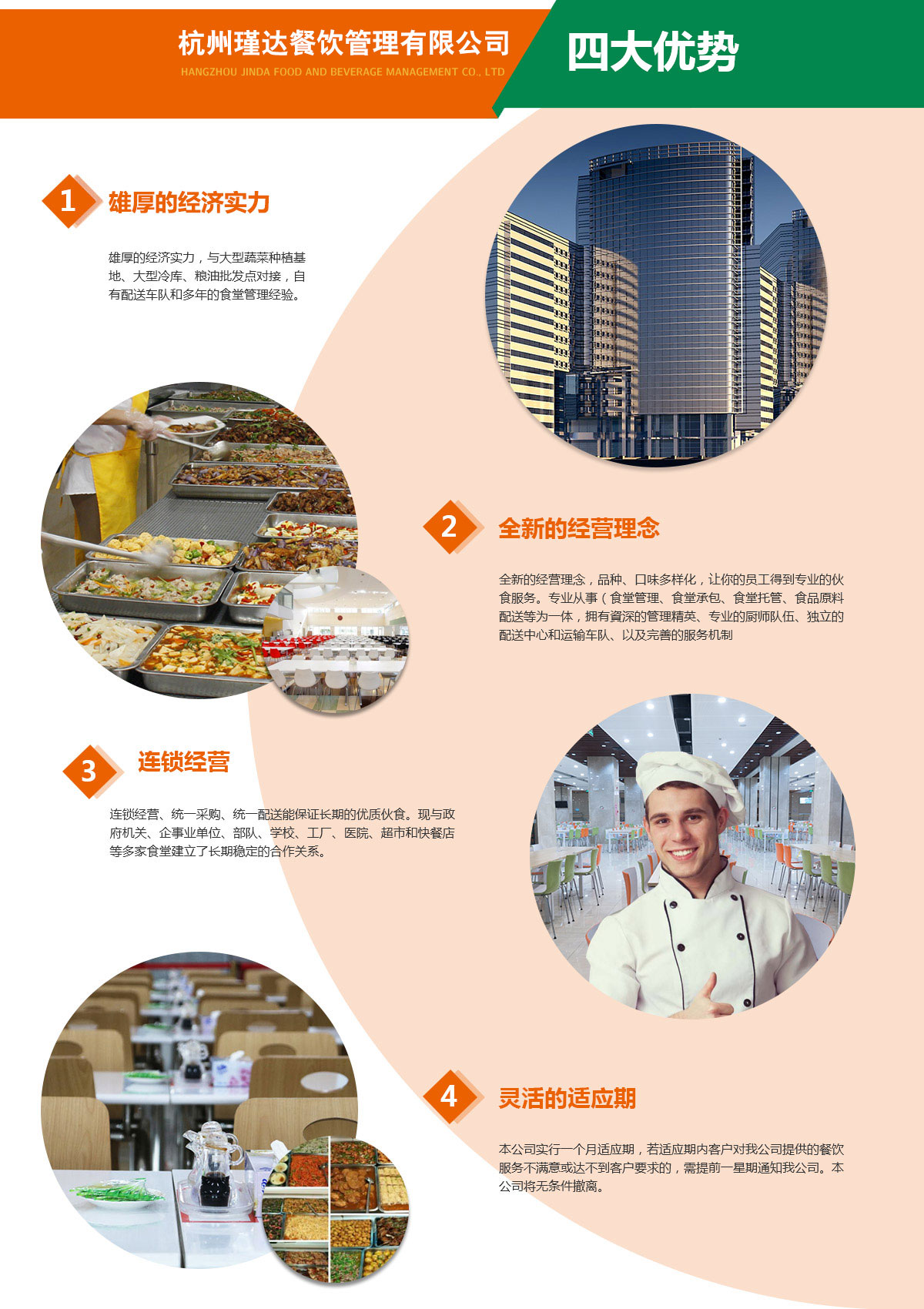 杭州瑾达餐饮管理有限公司隶属瑾达餐饮集团, 公司本人已有10多年承包大中型食堂,是一家经验丰富、实力雄厚专业从事企业单位食堂承包、学校食堂托管、营养配送及物流配送、 食堂承包为一体的连锁经营服务实体,极具发展潜力和竞争能力的杭州食堂承包商。